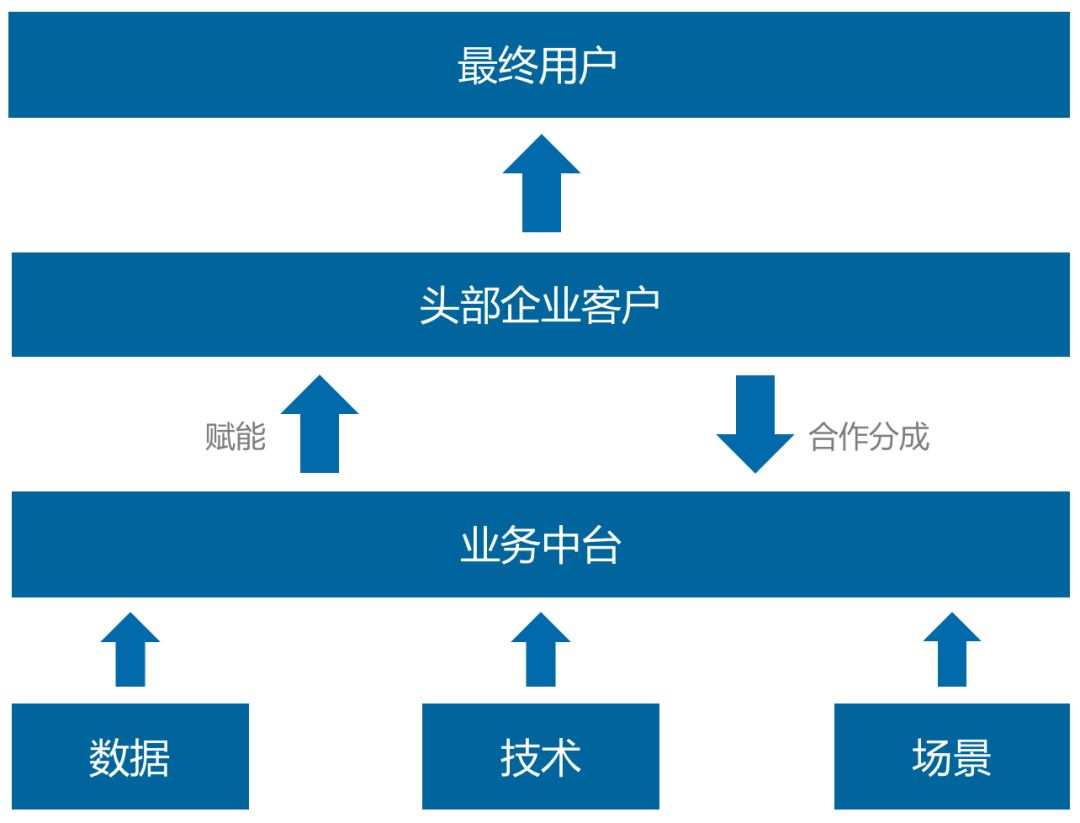 合作分成会是一种全新的模式。数据、技术和应用场景结合,形成业务中台,利用业务中台赋能头部企业,和头部企业客户合作,帮助企业客户解决完整场景问题,实现与企业客户的合作分成。
