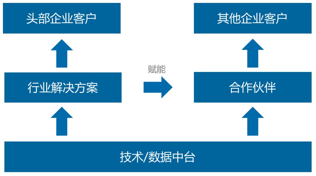 上图是典型的技术赋能模式,基于技术中台或者数据中台形成行业解决方案,服务头部公司。通过头部公司积累业务场景能力,形成最佳实践,赋能合作伙伴,通过合作伙伴服务其他公司。