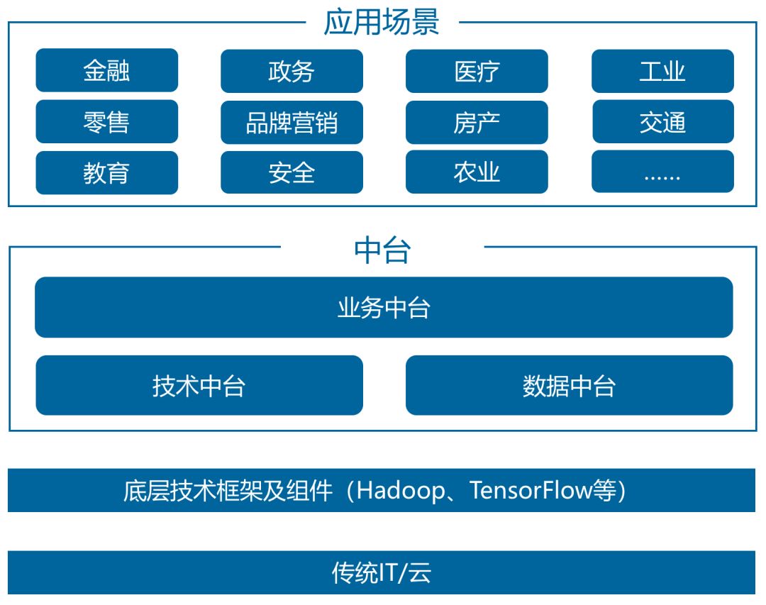 数据智能领域核心分为两个细分领域,中台和应用场景。其中中台包含技术中台、数据中台和业务中台,应用场景则按照不同行业进行了划分。