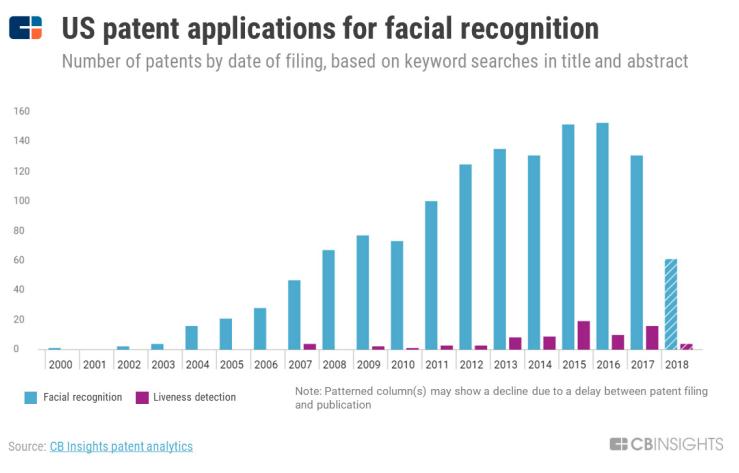 CB Insights报告表示,在美国,人们对面部识别技术的兴趣近年来激增,专利申请数量在2016年前呈现爆炸式增长,最近今年专利申请数量也依然保持较高水平。