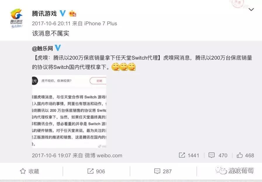 腾讯和NS的传言早已存在,早在2017年10月6日,虎嗅就曾爆料称,腾讯以保底200万台销量的协议拿下了NS的中国区代理权,但之后@腾讯游戏回应称“该消息不属实”。如今再翻出这条微博,颇有些时移世易,换了人间的感觉。