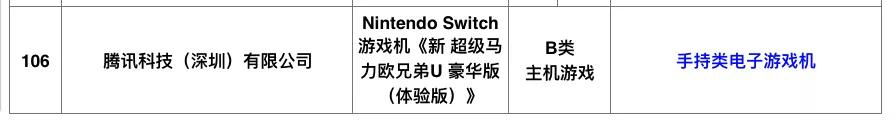 随后有人发现,广东省文化和旅游厅在官网上公示了一则名为《2019年第一季度广东省游戏游艺设备内容审核通过机型机种目录》的文件,目录表格的最后一款产品赫然是Nentendo Switch游戏机,而企业名称则是“腾讯科技(深圳)有限公司。