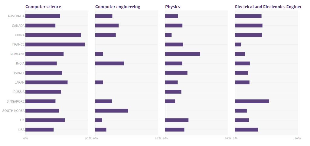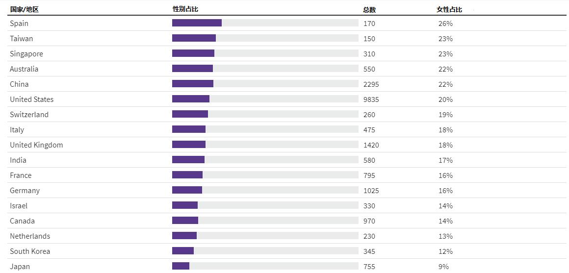 此次调查的数据表明,不同国家/地区之间的性别差距各不相同。女性作者占比高于18%的平均水平的国家/地区包括西班牙(26%)、台湾(23%)、新加坡(23%)、中国大陆(22%)、澳大利亚(22%)、美国(20%)、瑞士(19%)。在绝对数量上,美国的女性作者数量最多,其后是中国、英国、德国、加拿大、法国、澳大利亚、印度、意大利与新加坡。