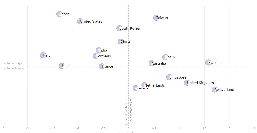 其中人才流入大于流出的10个国家/地区是:中国台湾、瑞典、韩国、西班牙、美国、瑞士、中国、日本、英国、澳大利亚。而在接受海外专家方面的赢家是瑞士和瑞典,外来人才占比分别达到了50%和49%。