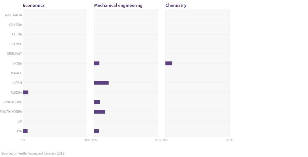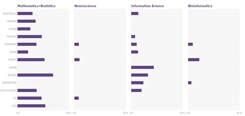 从LinkedIn样本分析来看,这些专家的主修专业各不一样。其中计算机科学是占比最高的(28%)。而且在一些国家这个比例甚至还要大,比如法国(47%)和中国(44%)。类似地,一些国家其中一些学科的占比也比平均水平突出。比如物理专业的平均占比为9%,但在德国其占比却高达28%。另一个例子是数学和统计。平均占比为18%,但以色列、美国这个数字就升到了27%,而俄罗斯更是高达35%。