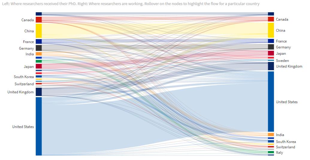 这一数据还可以让我们对比每个国家/地区的人才流入流出情况。人才流入表示的是在x国/地区工作但是在y国/地区拿到博士学位的人数除以x国/地区的AI人才总数。这个指标可以用来衡量一个生态体系对人才的吸引力。