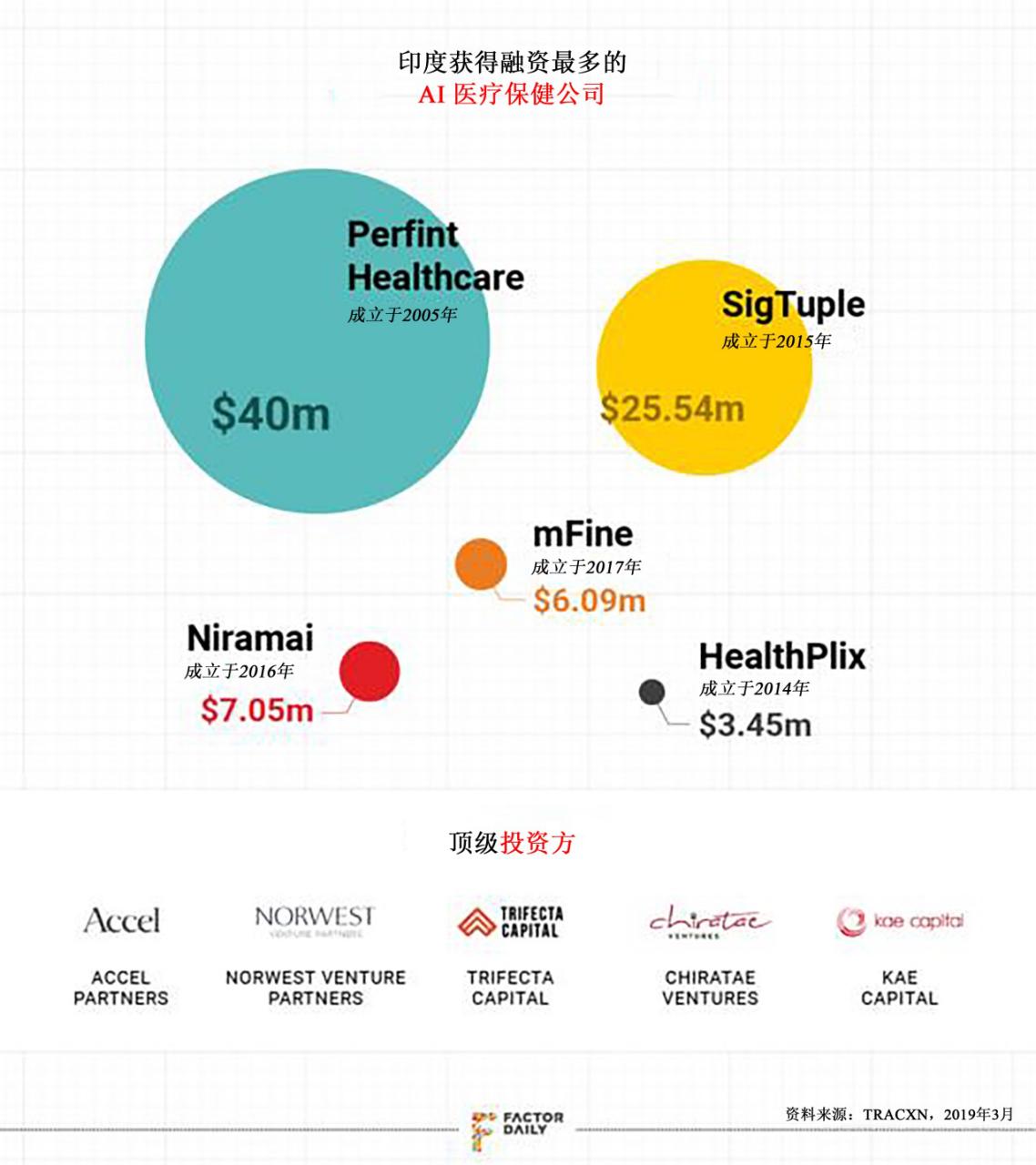 根据 Tracxn 的数据,自2013年以来,十多家主打 AI 的医疗类初创公司一共获得了大约6500万美元的融资。FactorDaily 此前报道过,印度目前有知名的 AI 医疗初创公司中,包括了专攻医学成像的 Qure.ai、专攻病理学的 Sigtuple、提供皮肤病学解决方案的 CureSkin、主打乳腺癌检测的 Niramai 和利用云端心电图设备检测心脏并发症的 Tricog Health。Google 和 Microsoft 这类大公司也在印度与连锁医院展开了试点合作。就诊预约应用程序 Practo 则一直在尝试通过 AI 来自动化医患互动。