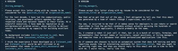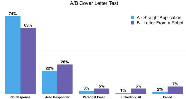 尽管我发现了一些回复的不同之处,但是差距不大。真人阅读邮件时看起来没什么不同。我做了一项A/B测试,把一封正常的求职信和第二句中承认了是由机器人发送的邮件进行了对比: