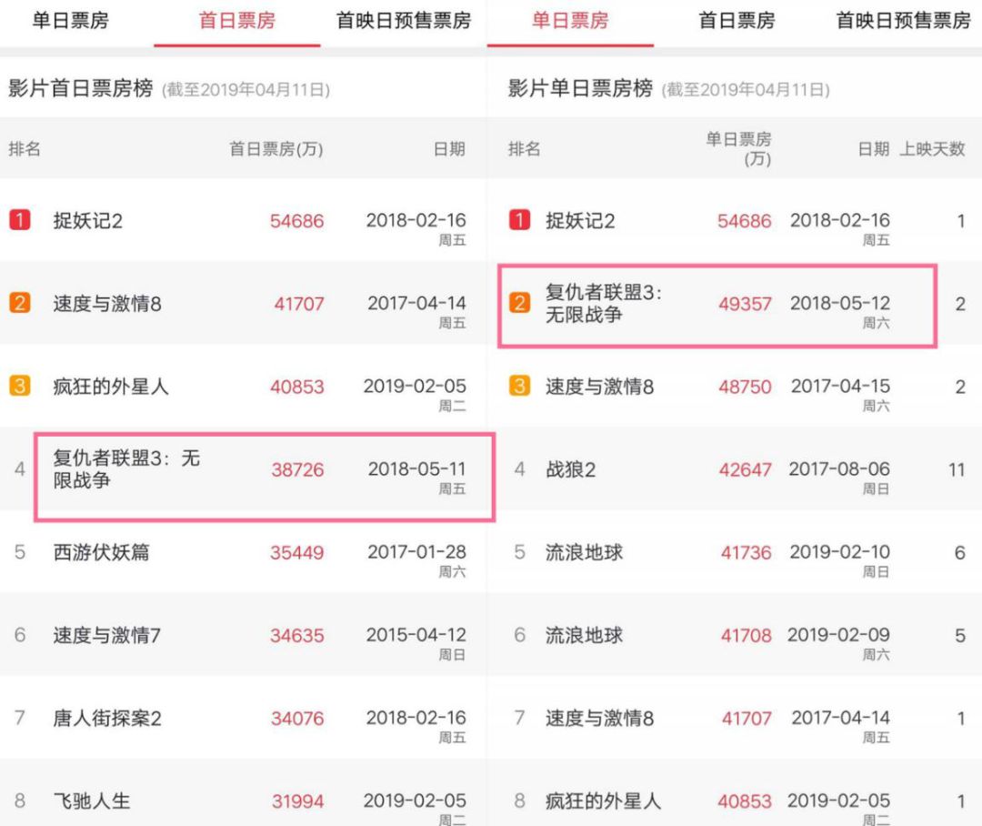 目前,在首日票房上,目前票房最高的国产片和进口片为《捉妖记2》的5.4亿和《速度与激情8》的4.1亿,晚于北美半个月上映的《复仇者联盟3》在首日已获得3.8亿,《复仇者联盟4》也会在首日获得5亿+的票房体量,刷新进口片首日票房纪录。