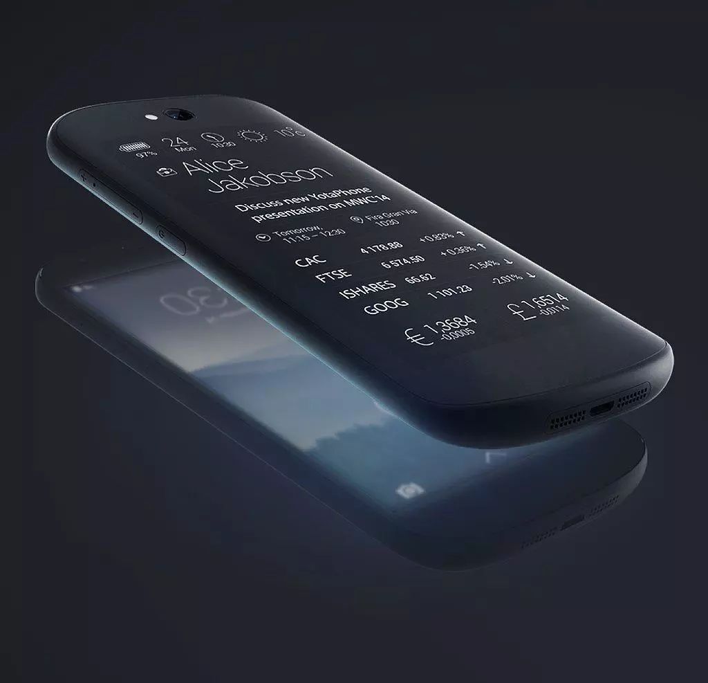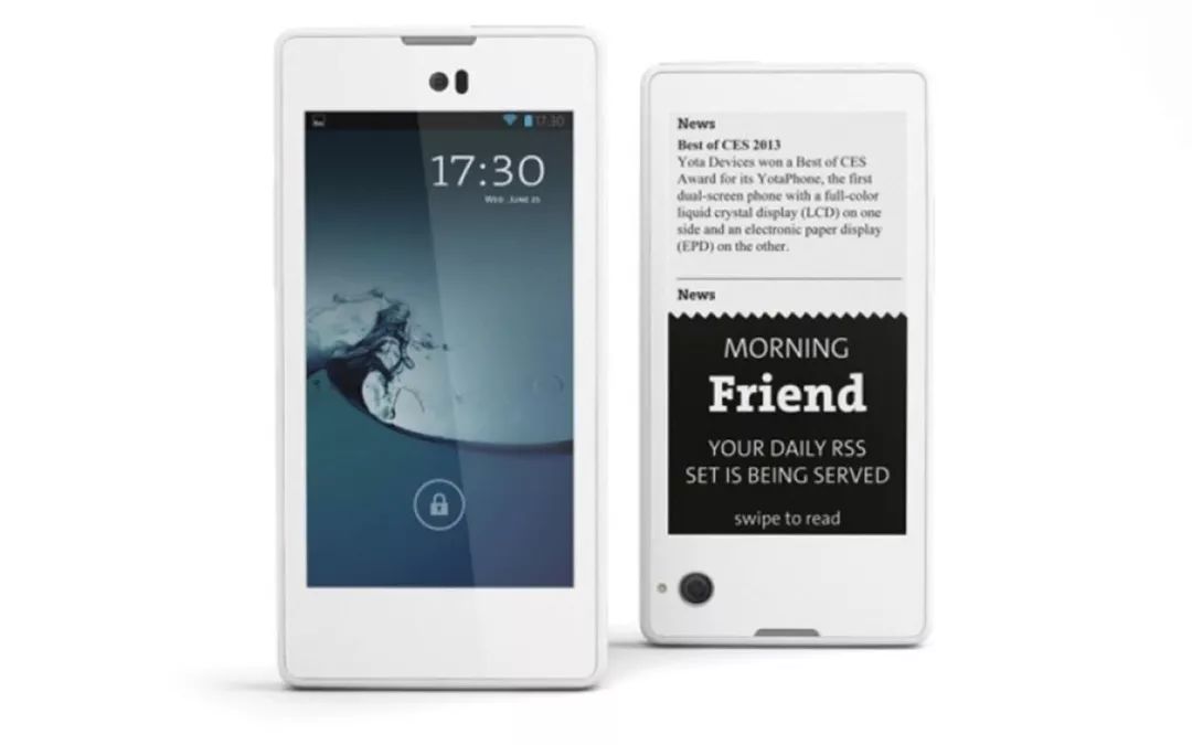 在 Yota Device 成立的两年后,它的首款产品 YotaPhone1 就面世了。正如前文所说的主打移动阅读市场,第一次将手机做成双屏形态,背部一块 E-Ink 电子墨水屏,护眼、低功耗、适合长时间阅读,手机翻过来即可看书,不用携带更多的东西。