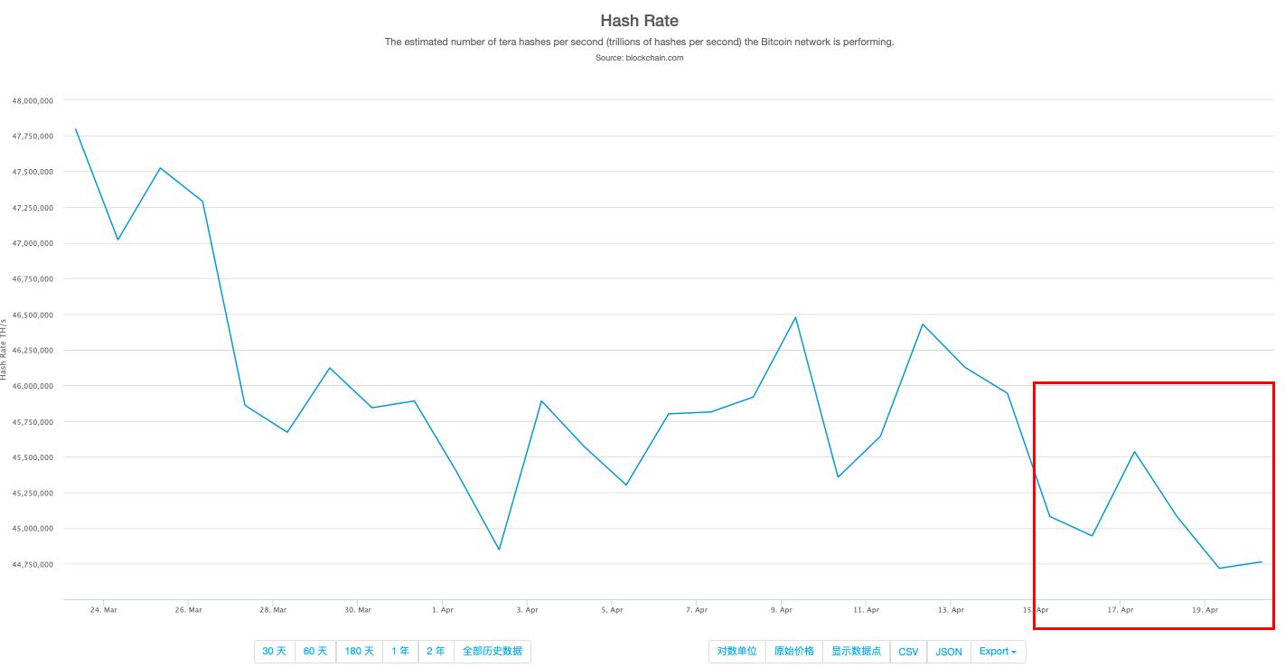 本周 BTC 哈希算力整体变化不大,4 月 17 日骤升后大幅下降至 44718.850 TH/s。