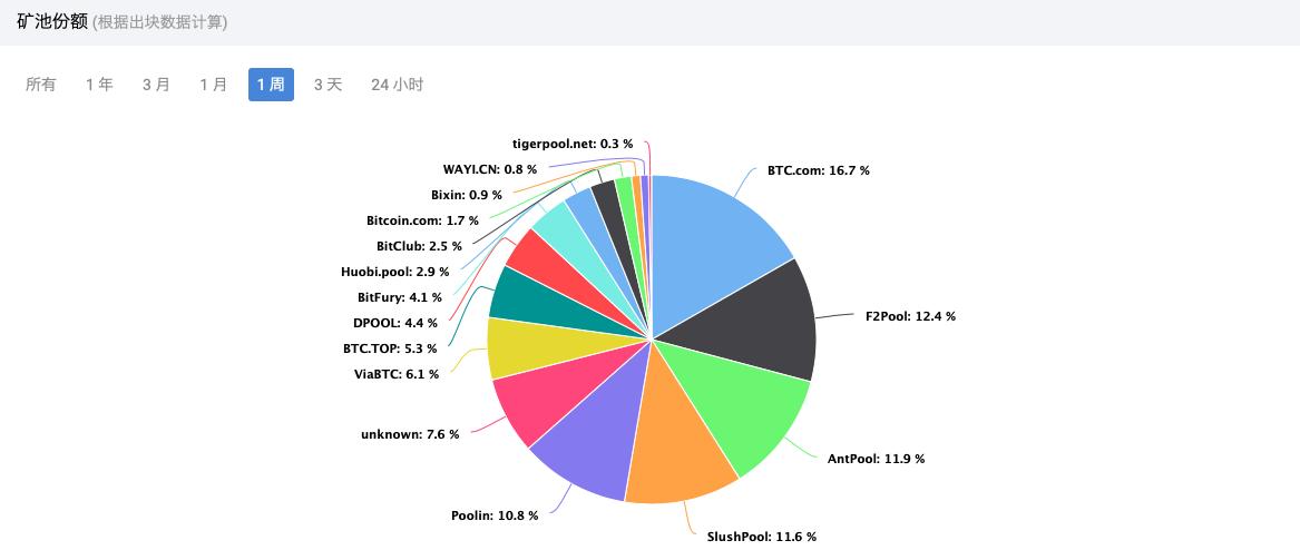 本周矿池份额较上周差异较小,BTC.com 份额上升。具体而言,根据出块份额计算,BTC.com 居第一位,占比 16.73%,算力 7.76 EH/s;F2pool 升至第二,占比 12.40%,算力 5.75 EH/s;蚂蚁矿池跌至第三,占比 11.91% ;算力 5.53 EH/s。紧随其后的是 Slushpool 和 Poolin。