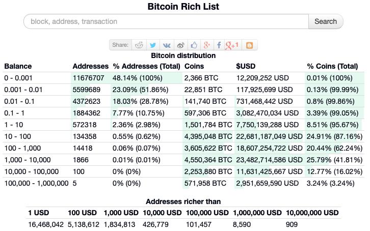 比特币地址中,48.83% 的地址持有不高于 0.001 的 BTC ,共 2374 BTC,占所有币的 0.01% ,较上周略涨;22.81% 的地址占有全部币量的 0.13% ,较上周略降。