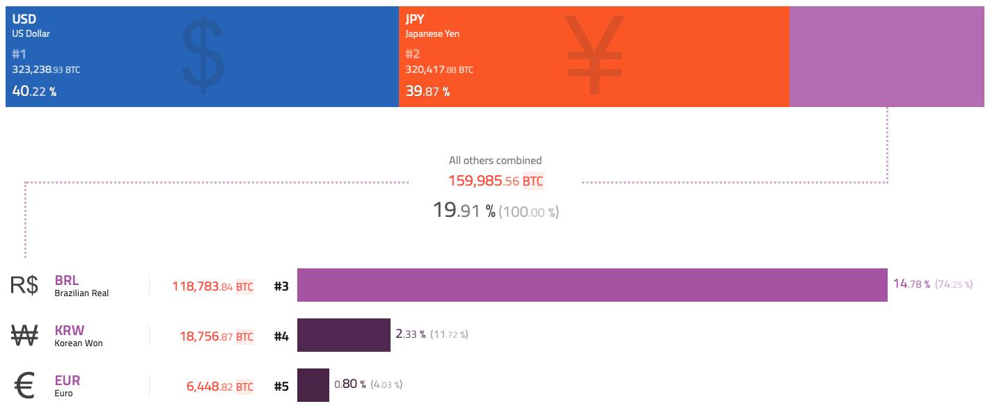 比特币兑法币交易中,本周美元反超日元,占比 40.22% ,排名第一;排名第二的日元,占比为 39.87%;巴西雷亚尔排名第三,占比为 14.78%;排名四五位的分别为韩元(2.33%)、欧元(0.80%)。其中美元和日元总占比大幅下降。