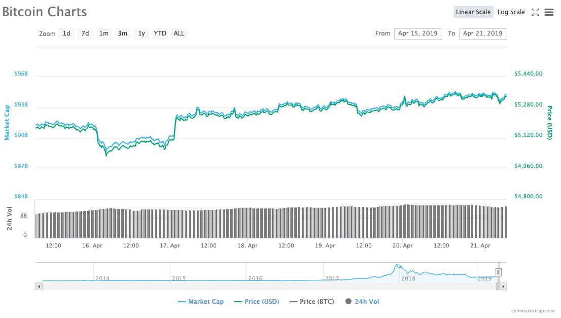 本周比特币价格在 4 月 16 日出现短幅下跌,整体缓慢上涨。20 日突破 5300 美元。当前报价 5304.24 美元。