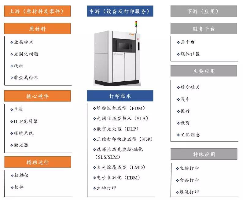 3D打印产业链条不算长,也并不复杂。比较核心的部分在于: