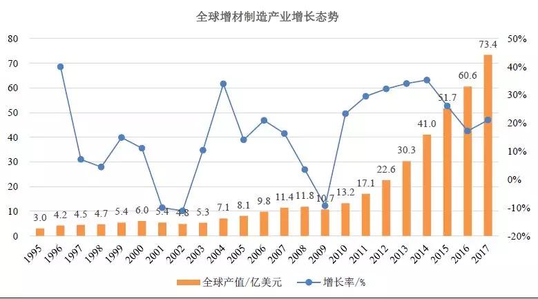 根据Wohlers统计,经过近十年的高速发展,2017年全球3D打印市场规模达到73亿美元,IDC预测2020年全球产值将达289亿美元。可以预见未来十年,全球增材制造产业仍将处于高速增长期,发展潜力巨大。