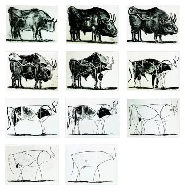 苹果大学里还有不少类似这样用其他学科的案例来启发员工的课程,比如在一堂课上一位导师展示毕加索著名的系列画作《公牛》,这 11 张版画里的公牛细节依次减少,最后仅剩下一条线勾勒出的轮廓。