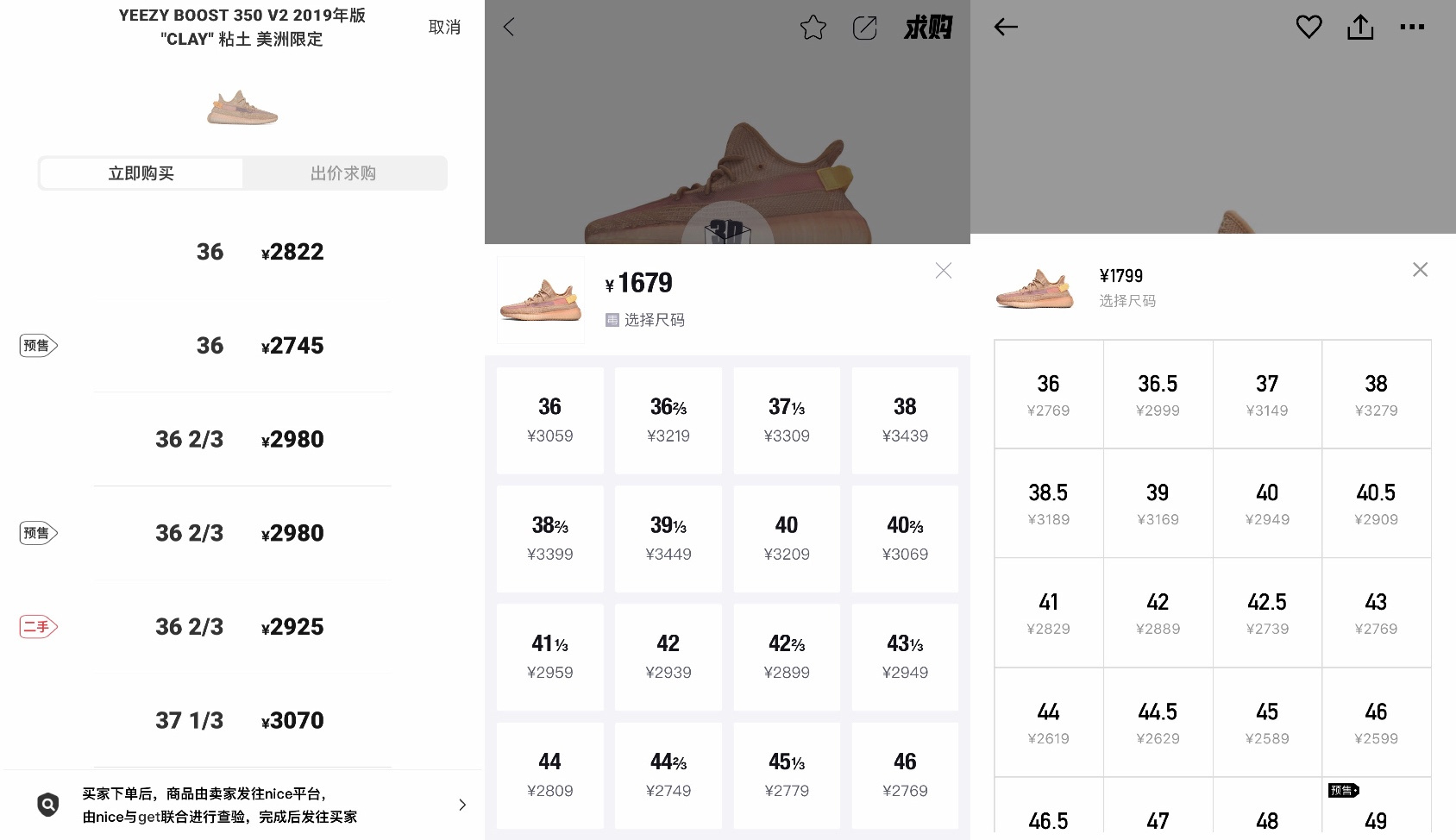 毒APP(上);随机款式价格对比(下):从左至右分别为nice、毒、有货