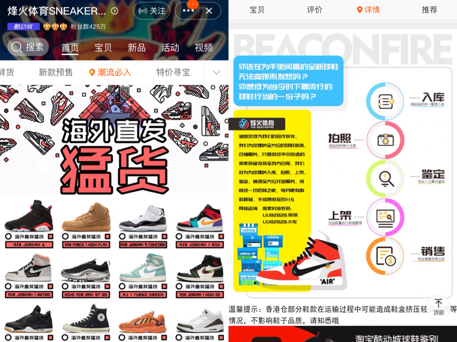 淘宝球鞋第一大卖家之一 — “烽火体育”从2011年开始入局,现在仅淘宝店铺就有400多万粉丝,据悉在2016年GMV就已经达到十亿元。虎扑作为国内最大的“直男聚集地”,也是最早出现免费“球鞋鉴定”的地方,而后又衍生出球鞋交易版块,用户通过发帖找到买家/买家,再自行完成交易。