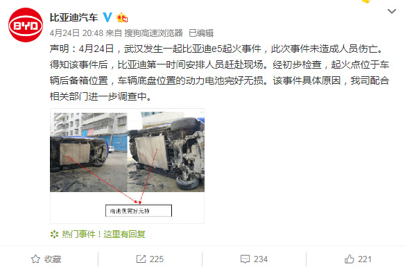 36氪讯,比亚迪汽车官方微博发布声明称:“4月24日,武汉发生一起比亚迪e5起火事件,此次事件未造成人员伤亡。得知该事件后,比亚迪第一时间安排人员赶赴现场。经初步检查,起火点位于车辆后备箱位置,车辆底盘位置的动力电池完好无损。该事件具体原因,我司配合相关部门进一步调查中。 ”