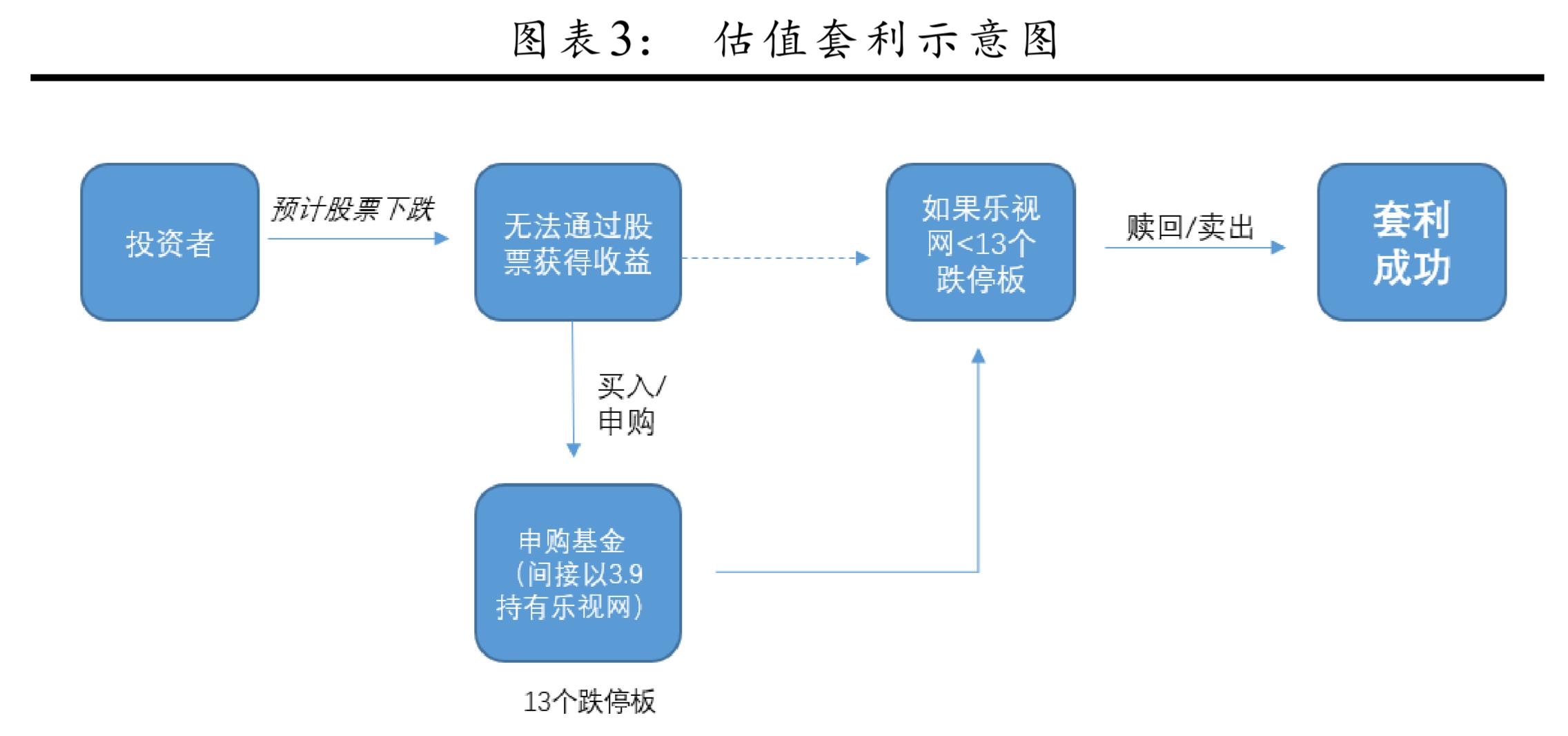 套利空间就在于此。在9个月的停牌期间,乐视网的估值遭遇基金三轮下调,在复牌前稳定在3.91元/股,相当于复牌后13个跌停。投机者看到的机会是,如果复牌后连续跌停次数没有达到13个,那么就有套利空间。