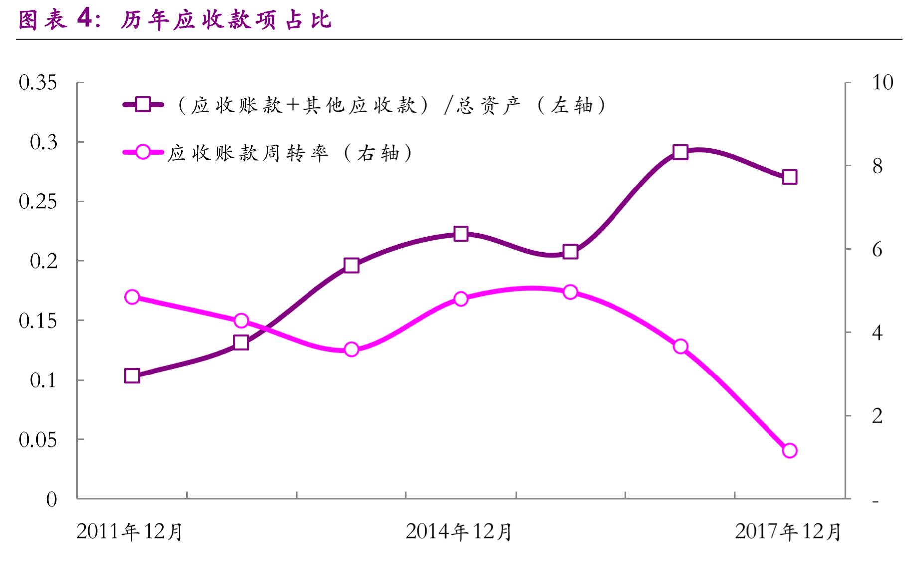 光大证券分析,从资产负债表的角度看,2011年末,乐视网应收账款和其他应收款两个科目在总资产中的占比仅为10.3%,而2016年末时增长至29.1%,绝对规模扩大了50.6倍。 这可能是由于其采用了更为激进的销售策略,例如加大了对下游客户的赊销份额或者是延长了销售账期。不断增长的应收账款美化了发行人的盈利能力,但其背后是现金回笼速度的减缓和应收账款周转率的下降,从而给资金链带来压力。