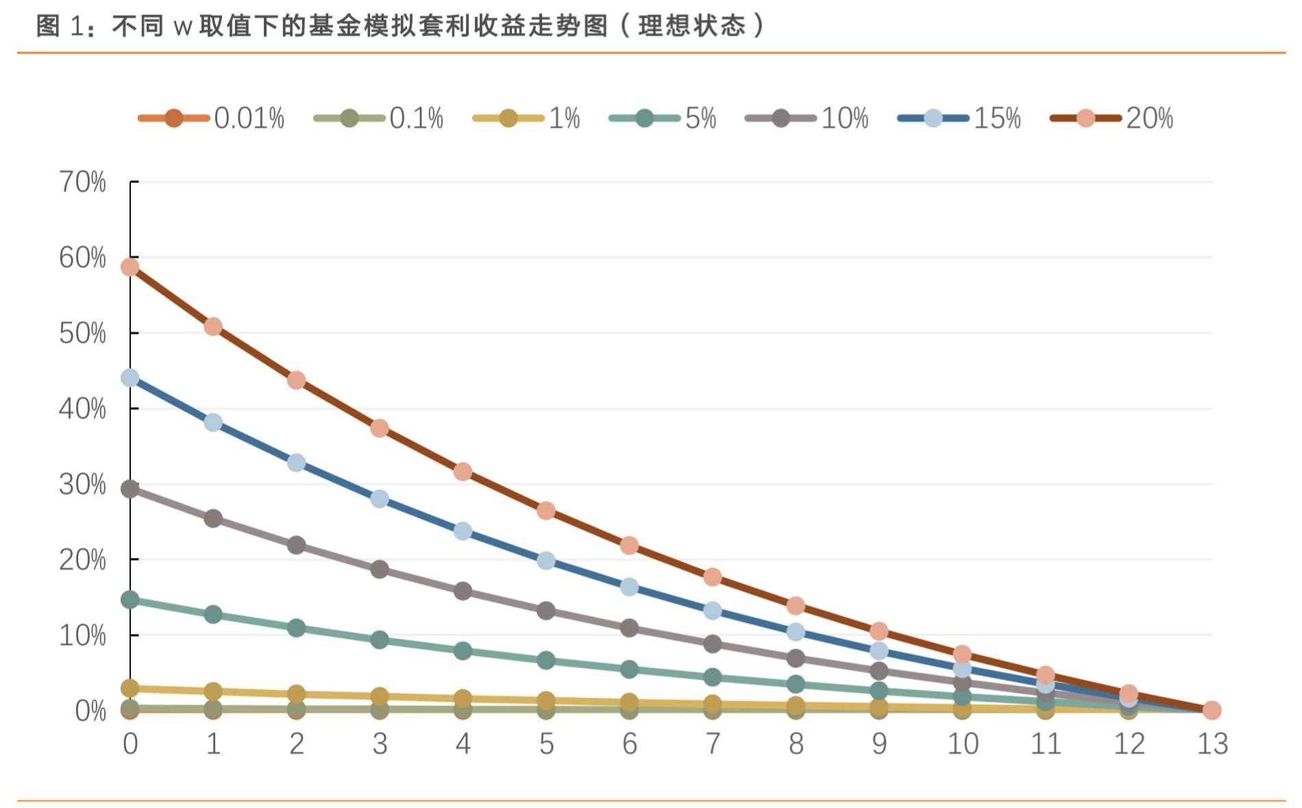 天风证券对此进行了金融工程仿真模拟,在不考虑各类费用的理想情况下,横轴为跌停板出现次数,纵轴为基金持有乐视网的股票市值占基金资产净值比例(w),则套利收益表现为: