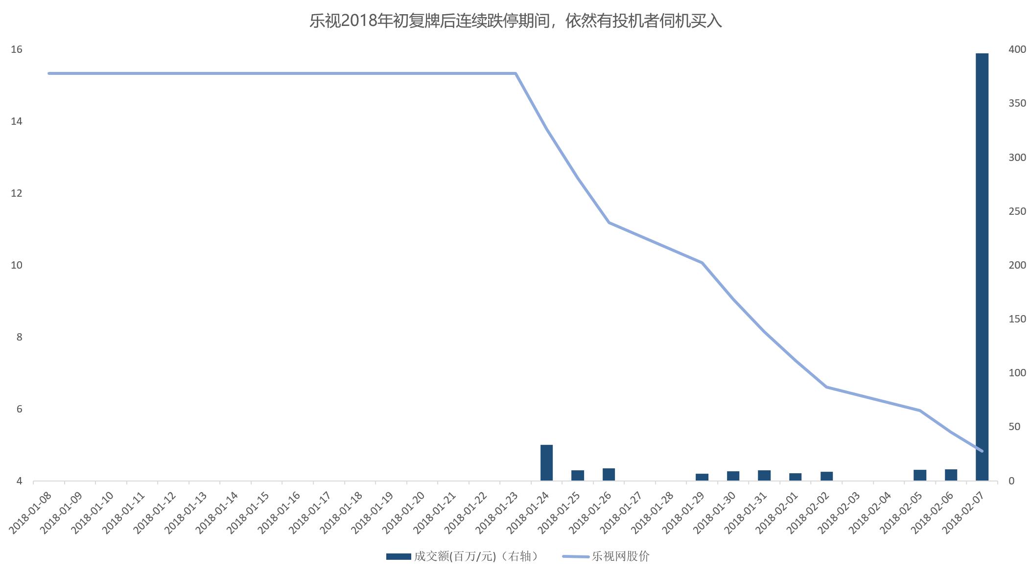 之所以有投机者愿意刀尖舔血,在于其中仍然存在可能的套利空间,尽管这个空间并不大。投机者在乐视身上看到的上一次机会,便是乐视在2017年4月至2018年1月漫长停牌后的连续跌停,在这些连续跌停中,投机者看到了“黄金”。