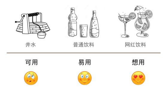 通过图1-3例解,可以让大家更直观理解这三种感受。图中三种方式都可解决用户口渴的需求,但是在满足用户需求过程中,用户心中的感受是不同的。