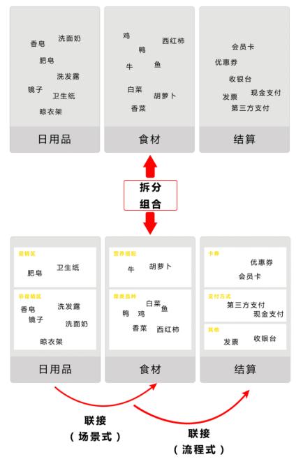 (2)组合过程:当我们把大筐拆分成小筐后,需要对筐内的东西进行合目的性地组合,以达到营销展现的目的。比如在日用品中,为了吸引用户可以设置促销区,将一些商品进行促销,以达到商业目的。