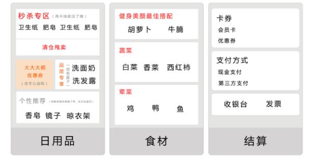 一用户目标,用户知道自己在哪里,知道自己在这里能干什么,知道想要的东西可以去哪里寻找到,比如用户想买肥皂,他知道要去日用品区域寻找,而不是去食材区,想要省钱,便去促销区逛逛,用户选购好商品,结算的后续流程,也明确知道在哪里可以完成。