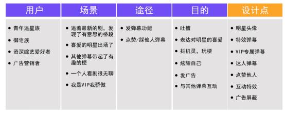 仅仅是弹幕一项功能,背后就包含着用户诸多的目的,把需求进行过程化拆解,我们才能更有针对性地对设计点进行挖掘与提炼。同样,这也可以是个逆向工程,当我们看到某个产品功能时,我们也可以逆向反推为什么设计这个功能,它的用户—场景—途径—目的是什么,这个需求过程设计者是如何进行考虑的。