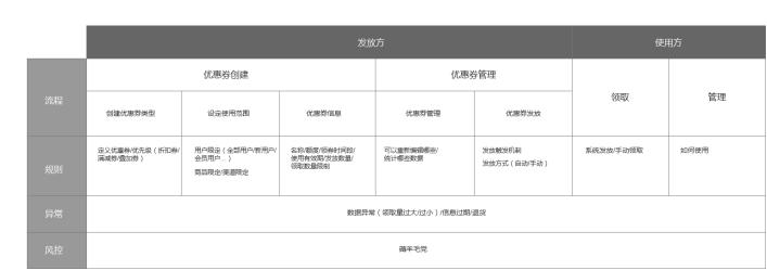 在进行业务和功能的设计时可以考虑四个方面:流程逻辑,规则,异常和风险。如图3-3优惠券设计,从创建优惠券到使用优惠券需要构建一个顺畅的流程。