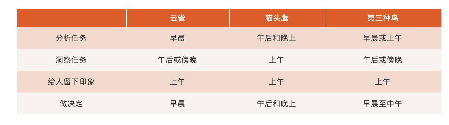 不同的人有着不同的能量类型。丹尼尔·平克(Daniel H. Pink)曾在《时机管理:完美时机的隐秘模式》中提出了能量管理的概念,他认为人的认知能力和能量水平在一天之中有非常大的波动。
