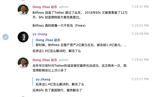 5.赵东问了 Bitfinex 的高管 Giancarlo Devasini,被冻结的资金100%可以解冻的,只是需要等待几周时间。赵东认为这些资金是用户的,不是Bitfinex的,美国政府无权冻结。