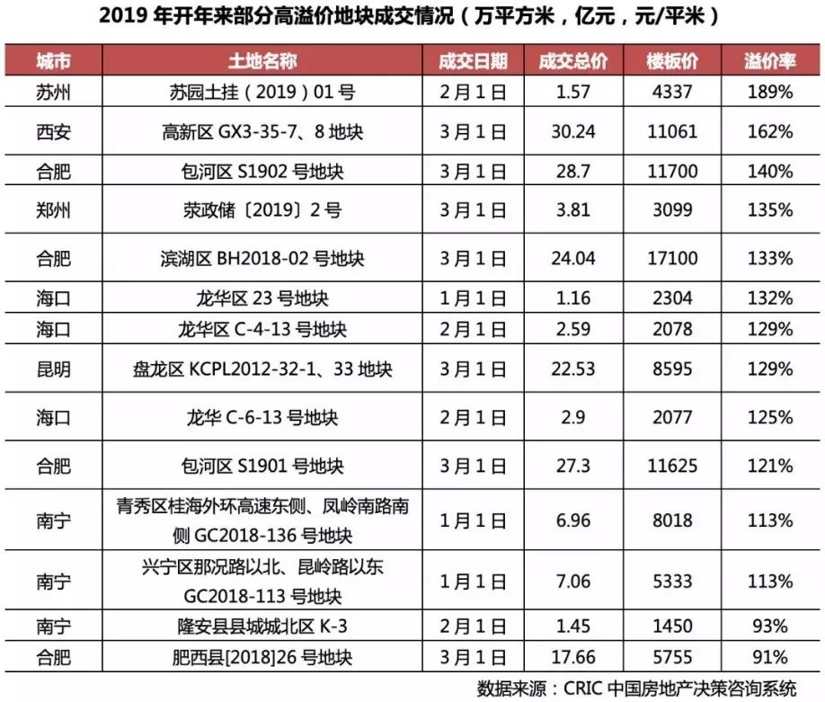 这是克而瑞整理的2019年1月到3月全国各地高溢价率的土地,你会发现这种场景已经持续了有一段时间了,只是4月更加明显而已