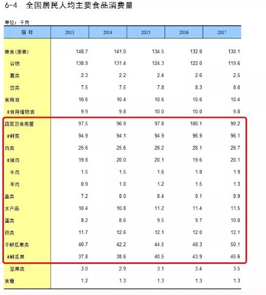 《中国统计年鉴》(2018年)数据显示:2013-2017五年时间内,我国居民人均生鲜食品消费量除鲜瓜果外,其余品类增长十分有限(如下图)。