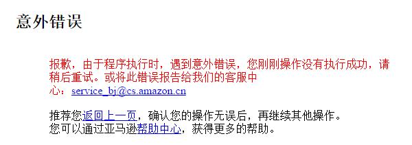 亚马逊中国官网(https://www.amazon.cn/)今日出现无法打开的问题,提示“意外错误”。此前亚马逊宣布,7月中旬之前关闭其在中国的国内电商业务,中国消费者将无法在亚马逊平台上从国内其他第三方商家那里购买商品。