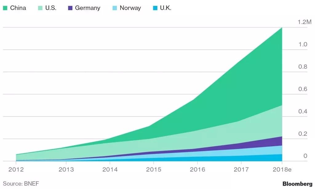 2012-2018年世界主要地区电动车销量增长,数据来源:BNEF