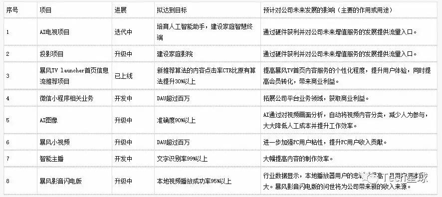 从暴风集团发布的2019年第一季度报告看,小程序确实是暴风正在推进的项目,暴风大耳朵、暴风影评、暴风AI电视等几款产品已经上线。不过从报告拟达到的目标DAU超百万看,这几款小程序应该还处于初级阶段。AI电视、投影项目仍旧是暴风集团的重点业务,尽管这几个业务目前仍未达到“通过硬件盈利并对公司未来增值服务的发展提供流量入口”的目标。