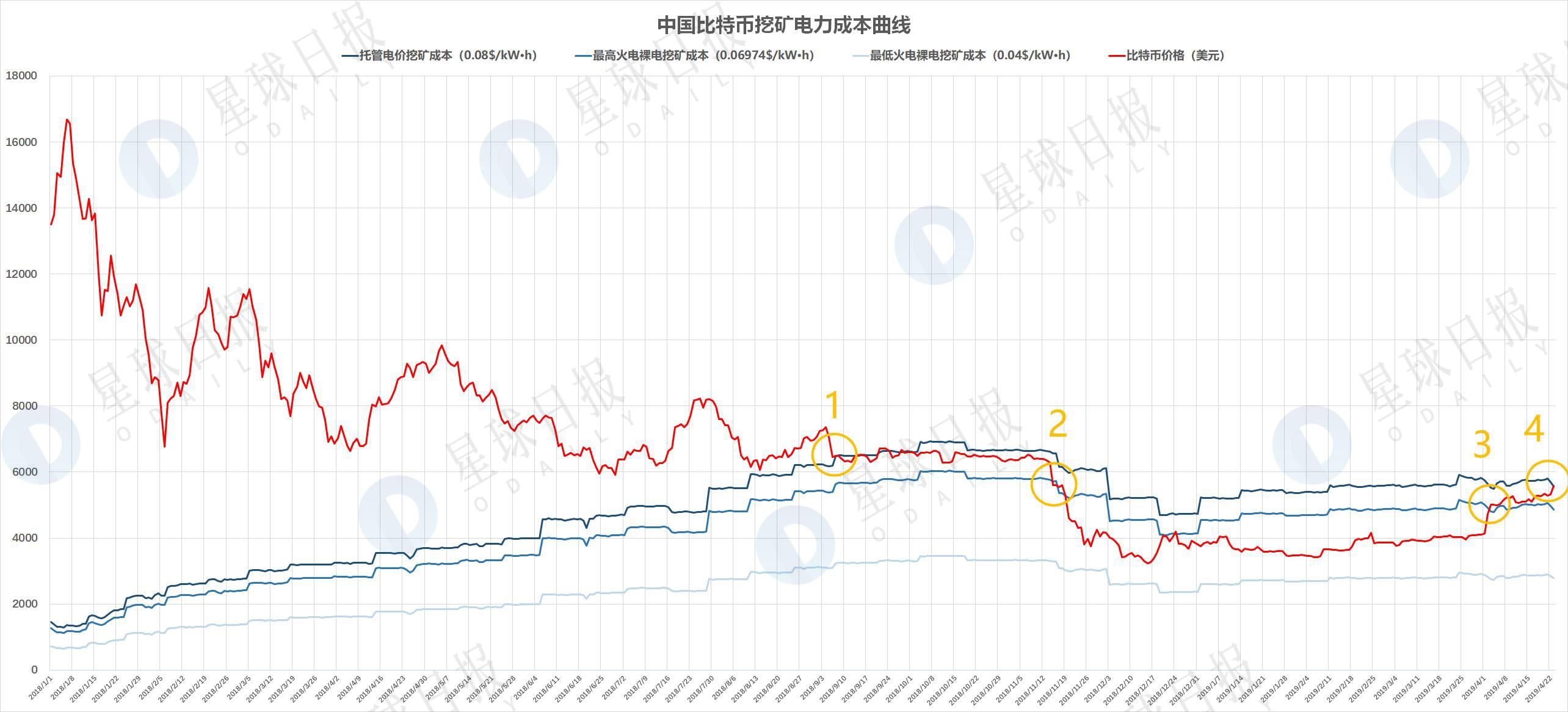 如果将范围缩小在中国(指矿机部署地),并设置一个平均电力价格(实际上,裸电电价基本固定),那么历史时间(算力)下的挖矿成本会形成一条曲线,如下图。