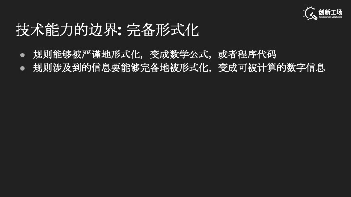 有两个很关键的地方,第一区块链上面所要的这个规则,这个规则要能够被非常完备的数字化和形式化。昨天有教授问我到底能不能用区块链来解决,也许未来可以,至少现在不可以。道德这件事情怎么形式化?毕竟我们是用计算机技术来支撑这个世界。前提是这个东西能被计算,要是不能被计算,计算机帮不了什么。但是这条线上,有很多的领域,把一些以前不可计算的东西、没法形式化的东西、没法很好数字化的东西数字化了。
