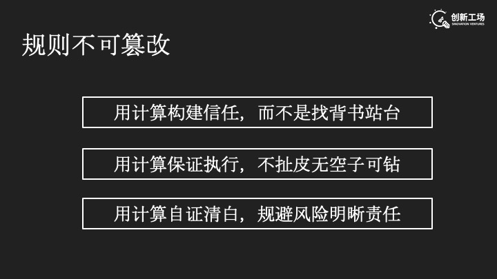 在业务场景可以非常完备的数字化和形式化的前提下,计算可以构建一个不为人为因素所控制的,牢不可破的规则,并且可以使得这个规则被严格执行。在这个技术之前,我们人类制定了很多规则,花很多精力,监管也好,事后处罚也好,努力使得这个规则被严格行。但是这件事情很难得到完全保障,因为里面是人在参与其中。但是区块链至少在一定的限定范围内,这些相关的规则能够完全被数字化和形式化,有了这个前提,区块链就可以使得这个规则被严格执行,没有人能够篡改。正因为这种技术的独特性,区块链会支撑未来新的这些业务和应用。整个行业大家都在找区块链应用市场。