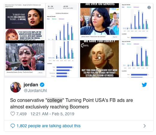 美国转折点(Turning Point USA)是一个主要面向大学生的非营利性保守党组织。最近,他们通过Facebook发出去的宣传广告,吸引了大批老年人的关注。