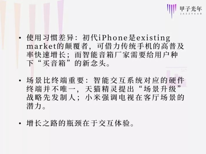 从以上表格的简单对比来看,iPhone成功的一个关键是供给端的完善,以及在使用习惯上,有前辈功能机为它铺路;而智能音箱则在向消费者普及新概念、改善生态和提供更极致的交互体验上,面临更多挑战。