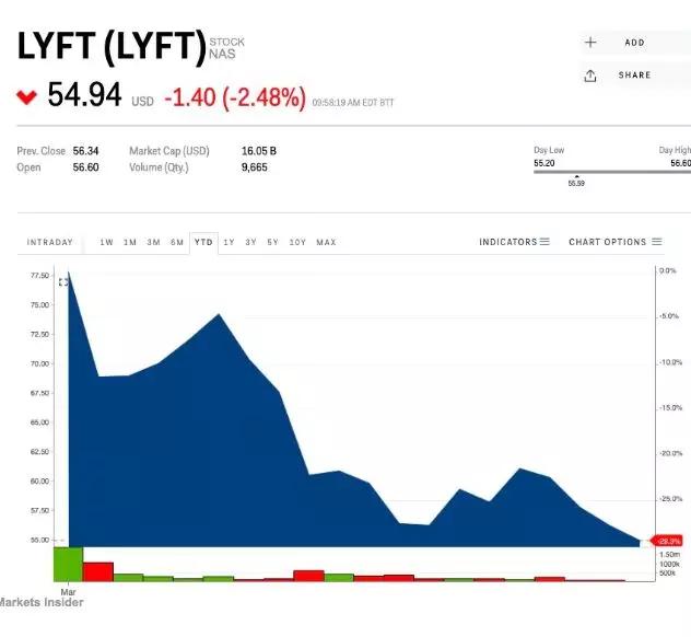 可公开交易后,Lyft股价一路下跌。而截至发稿,距离上市仅一个月,Lyft股价跌到59美金一股,比最高点蒸发超过三分之一市值。