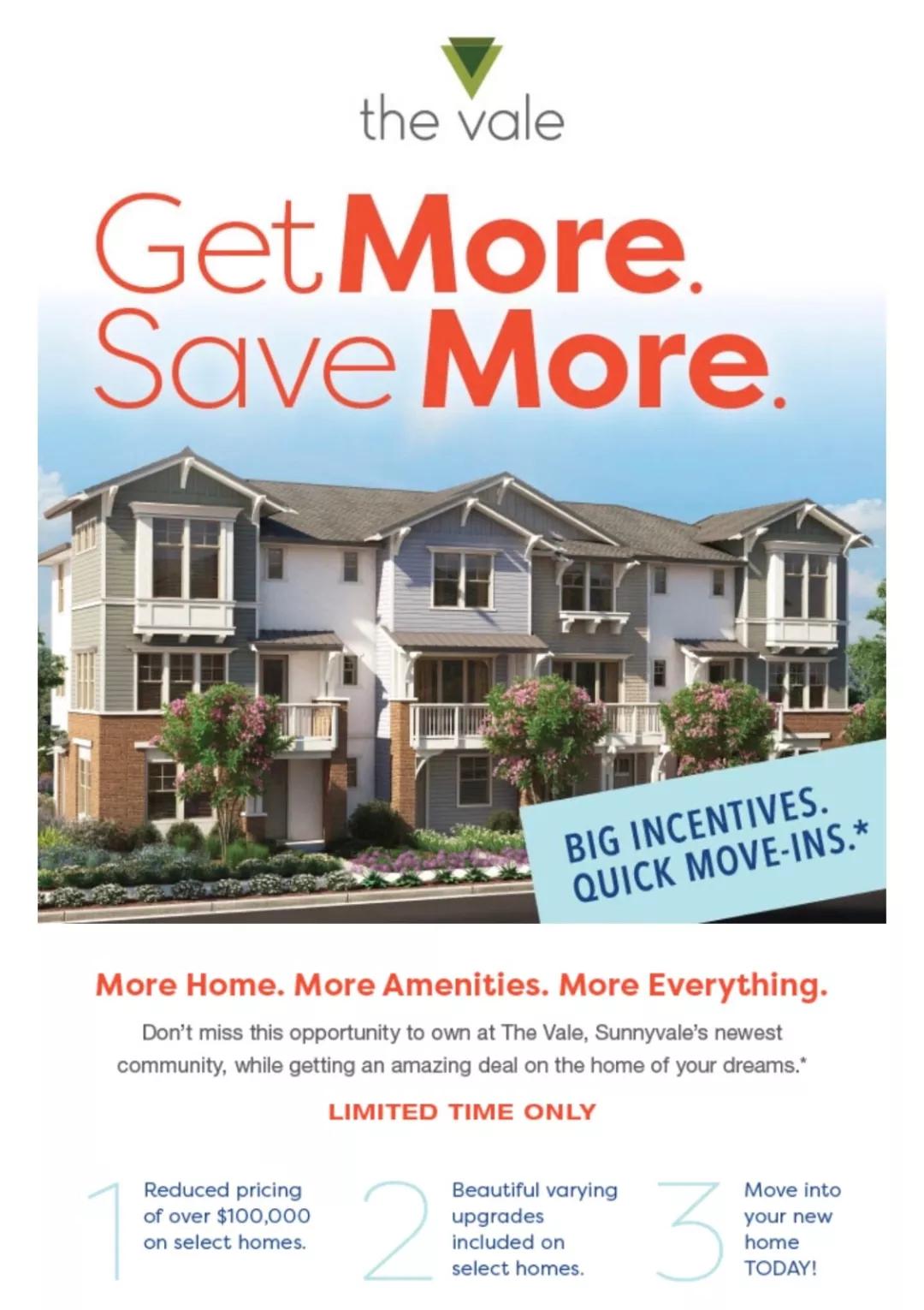 Sunnyvale市曾经一房难求的新房楼盘也不得不像沃尔玛促销一样打出“赠送更多,节省更多”以及“直接降价10万”的广告。