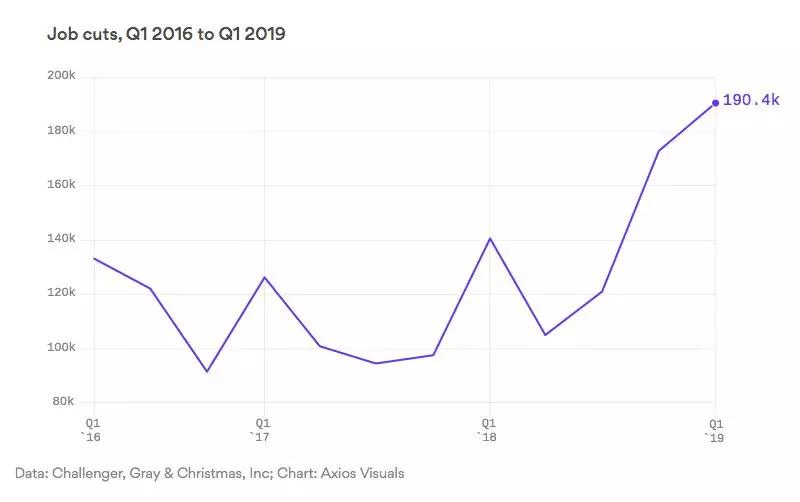 根据猎头公司Challenger, Gray&Christmas上周公布的数据来看,美国在刚刚过去的2019年第一季度经历了2009年来第一季度裁员数量的顶峰——共裁员19万人。