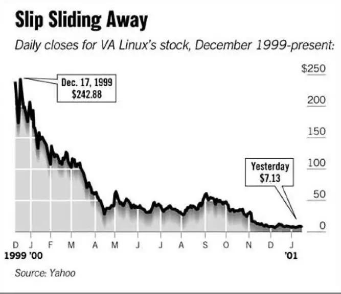 在1999年,科技圈泡沫鼎盛时期,一共有546家公司申请IPO,其中117家科技公司在上市第一天股价增长超过100%,而最疯狂的VA Linux在上市第一天股价暴涨733%,Foundry Networks以及Cobaltnetworks均有首日增幅约500%的疯狂历史。